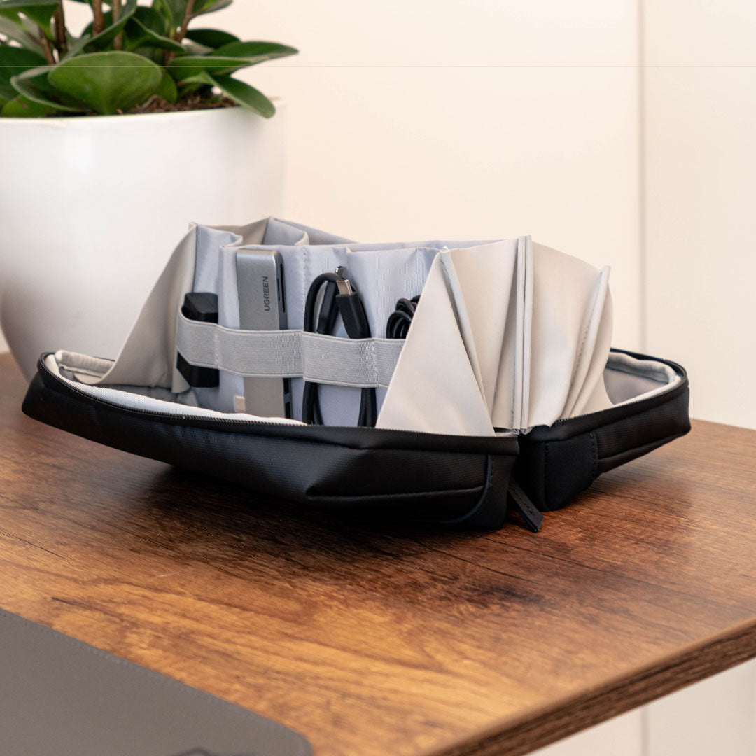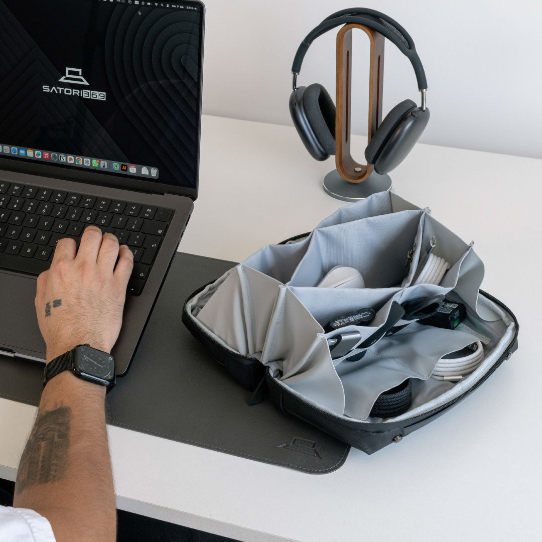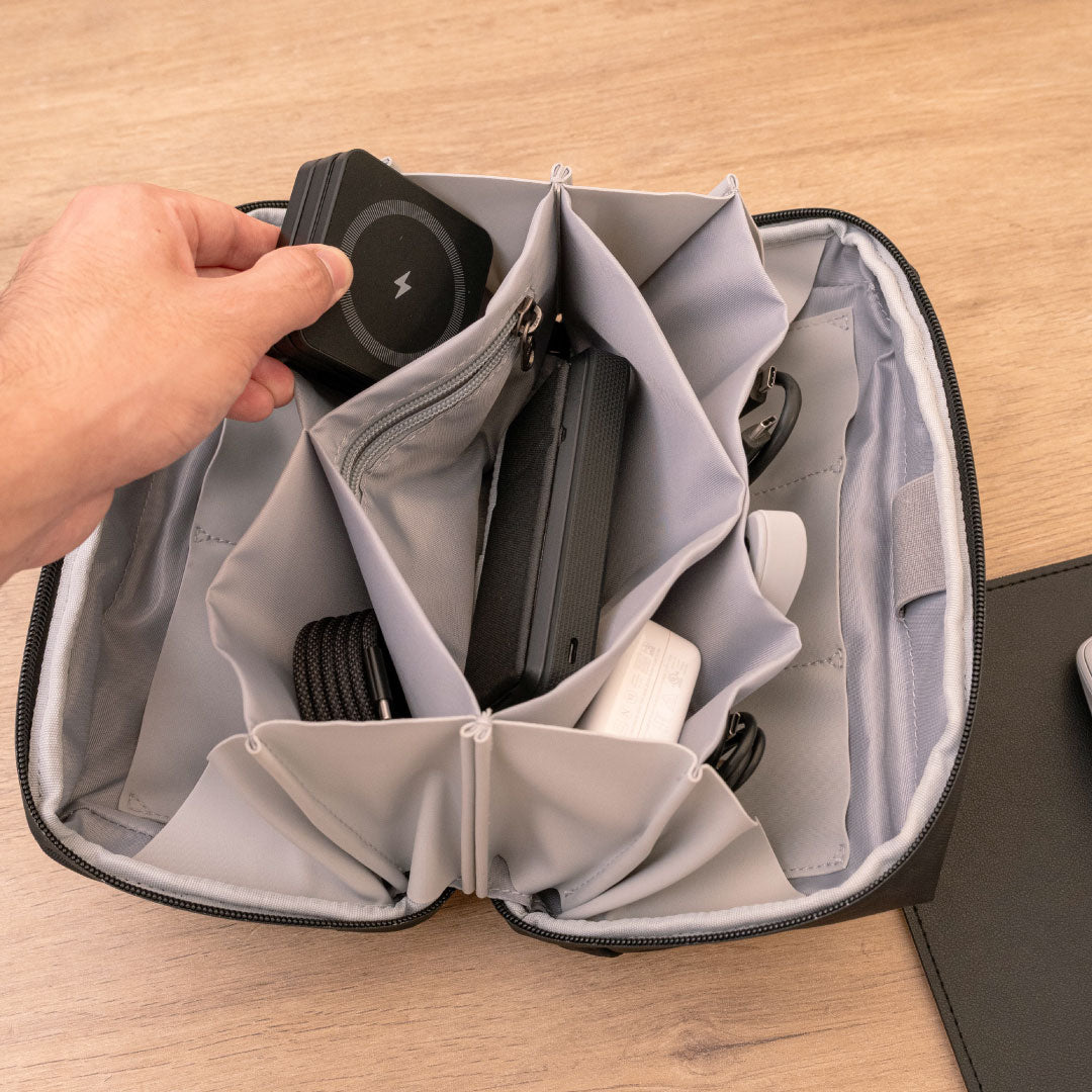 Hecho con poliéster 1200D y microfibra de alta resistencia, este estuche protege tus accesorios de la humedad y del uso diario. Gracias a su separador plegable, puedes personalizar los espacios según lo que lleves: cables, cargadores, adaptadores, discos duros, auriculares o smartwatch. Compacto, ligero y elegante, es el compañero perfecto para viajes, oficina o el día a día.