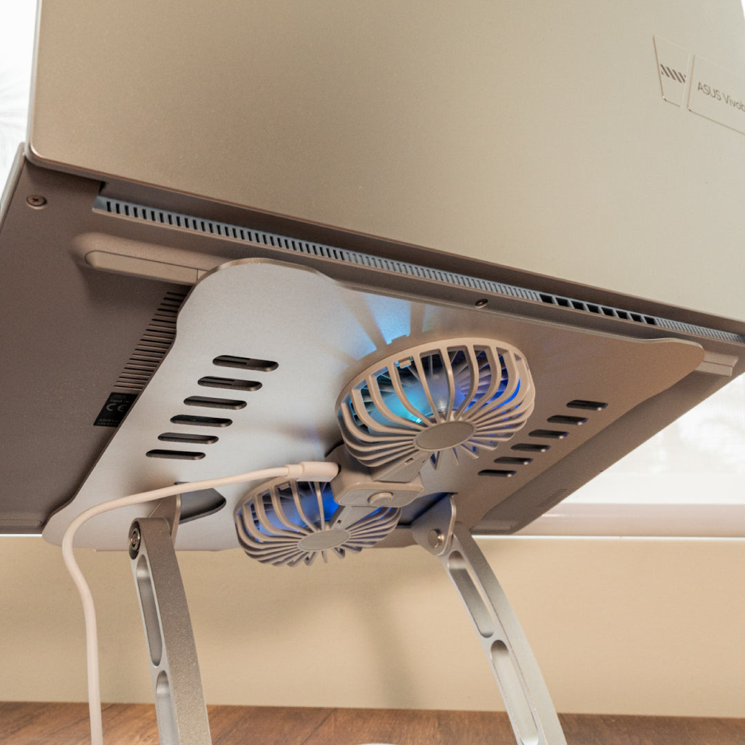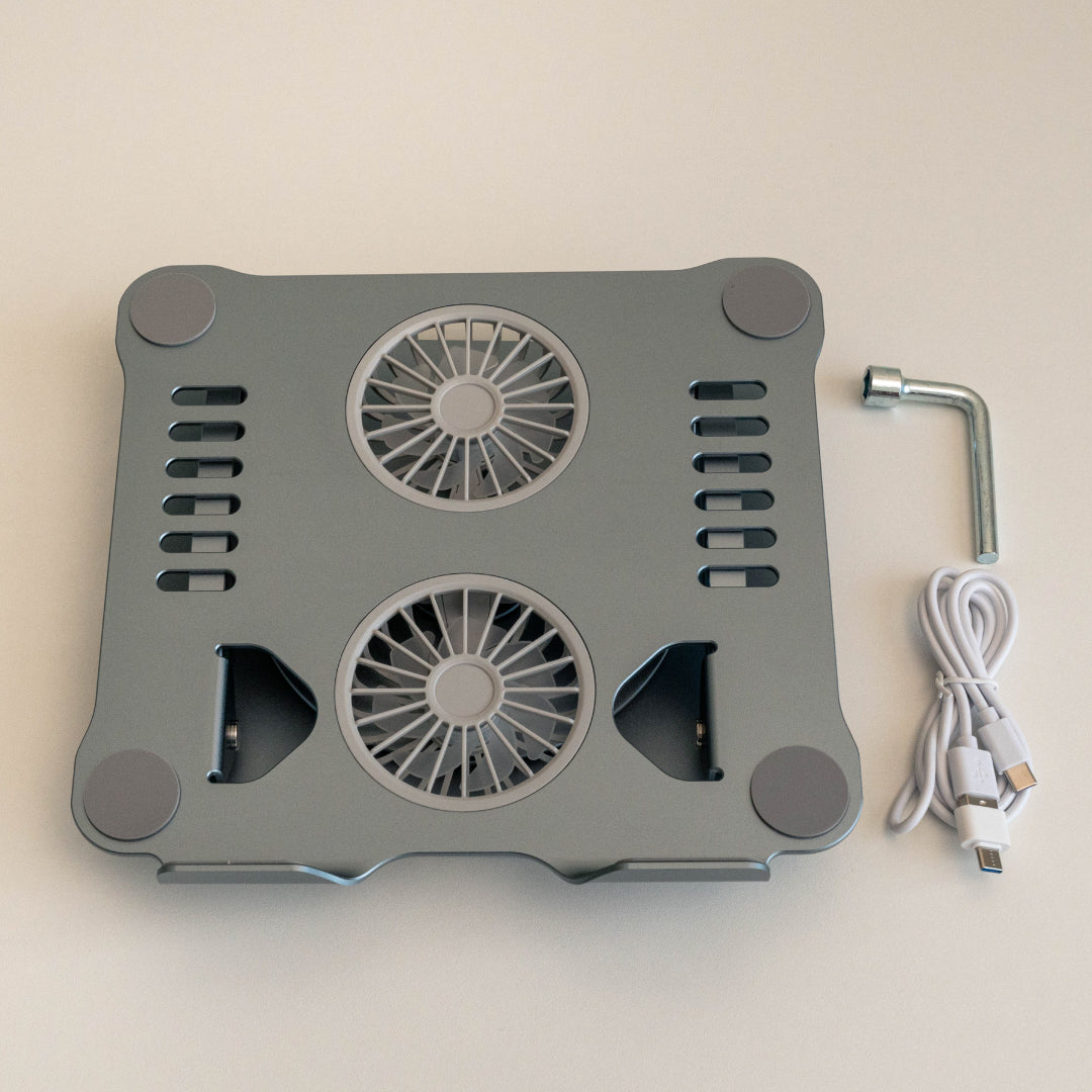 Hecho de aluminio. Cuenta con protectores de goma para las zonas de contacto con la laptop. Los ventiladores son de policarbonato.