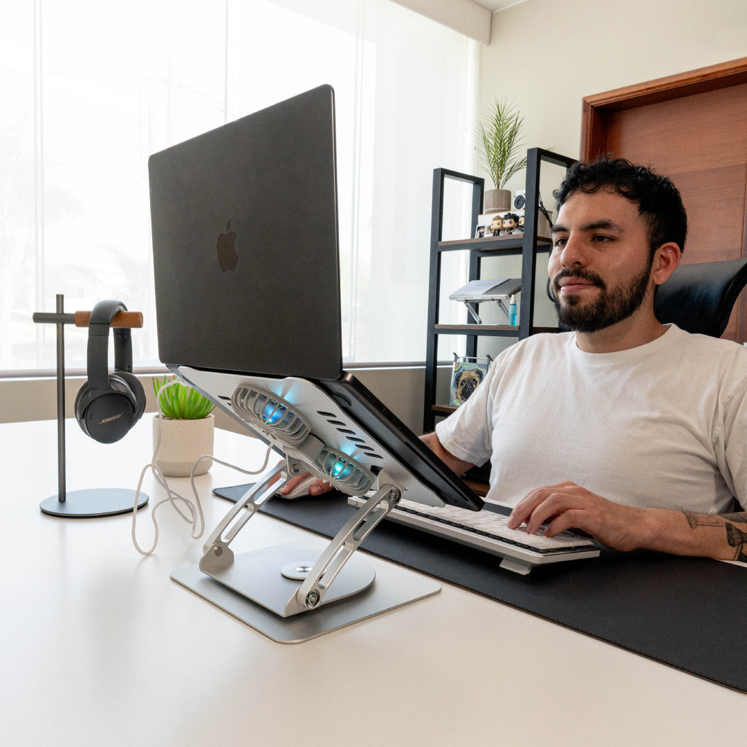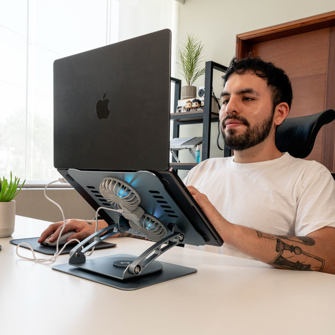 El Soporte Giratorio 360° para Laptop con Ventilador de Satori369 combina ergonomía, refrigeración y flexibilidad en un solo accesorio. Diseñado para laptops de hasta 17”, te permite ajustar la altura para mejorar tu postura, girar la pantalla fácilmente y mantener tu equipo fresco gracias a su ventilador integrado.