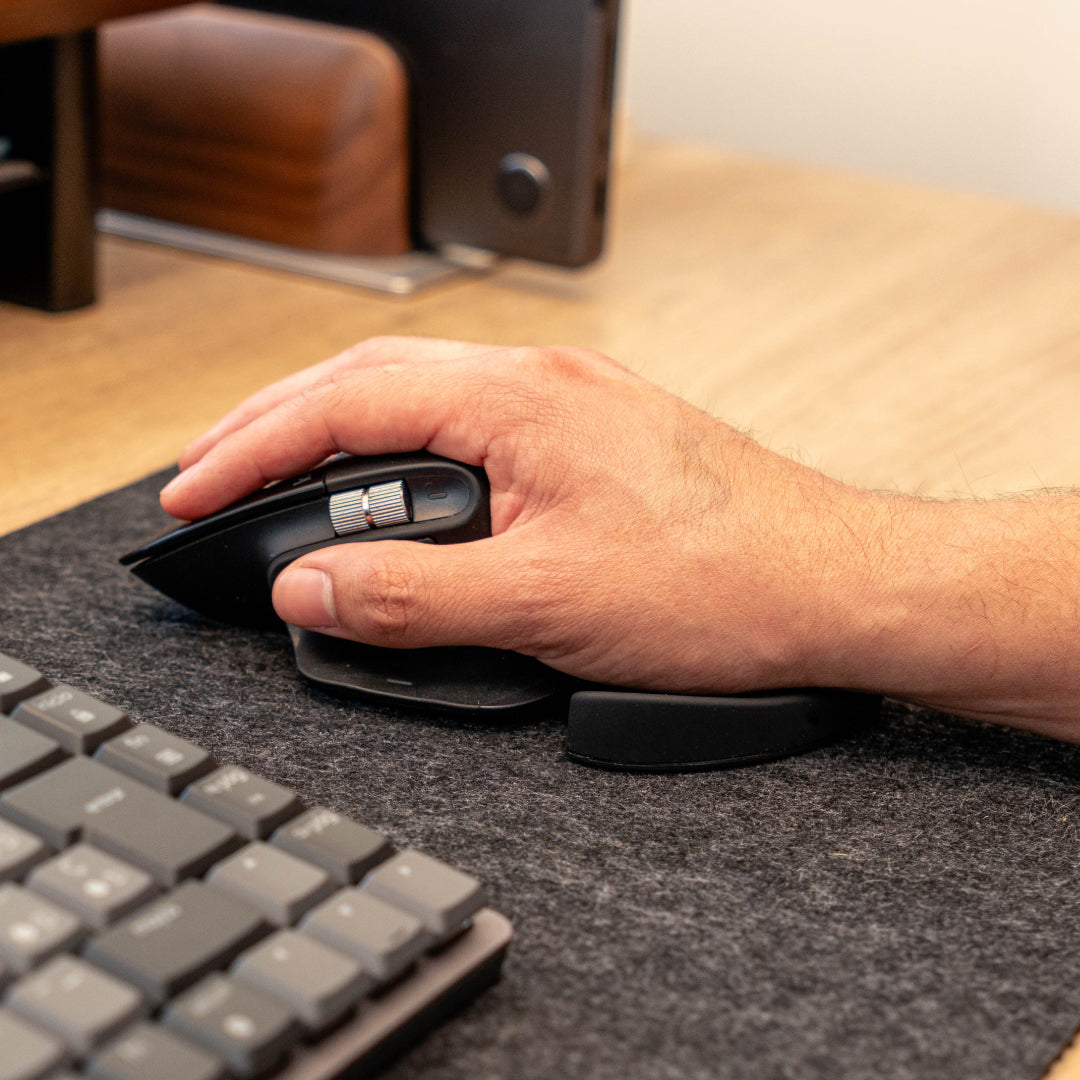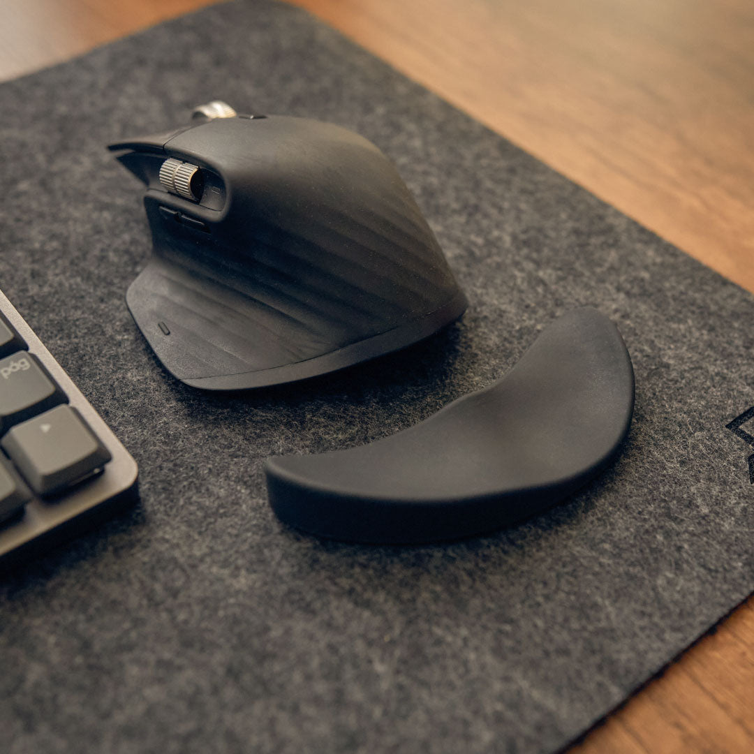 Importante: este modelo está optimizado para la mano derecha y no es compatible con mouse verticales, pues estos no permiten el apoyo contundente y constante que este diseño requiere. Fue ideado para mouse planos que permitan que la palma descanse completamente y que el brazo se desplace libremente sobre el reposamuñecas.