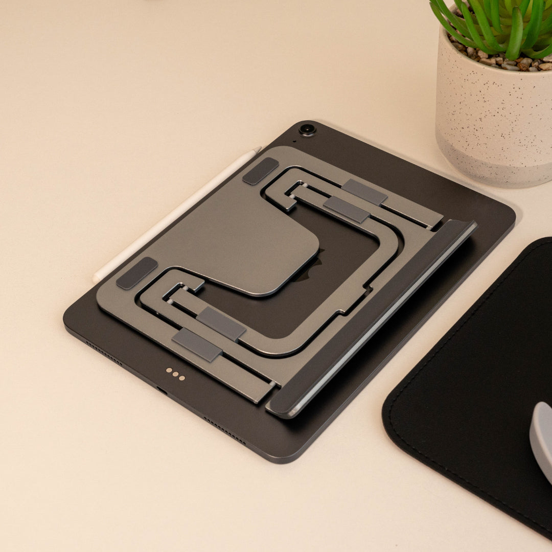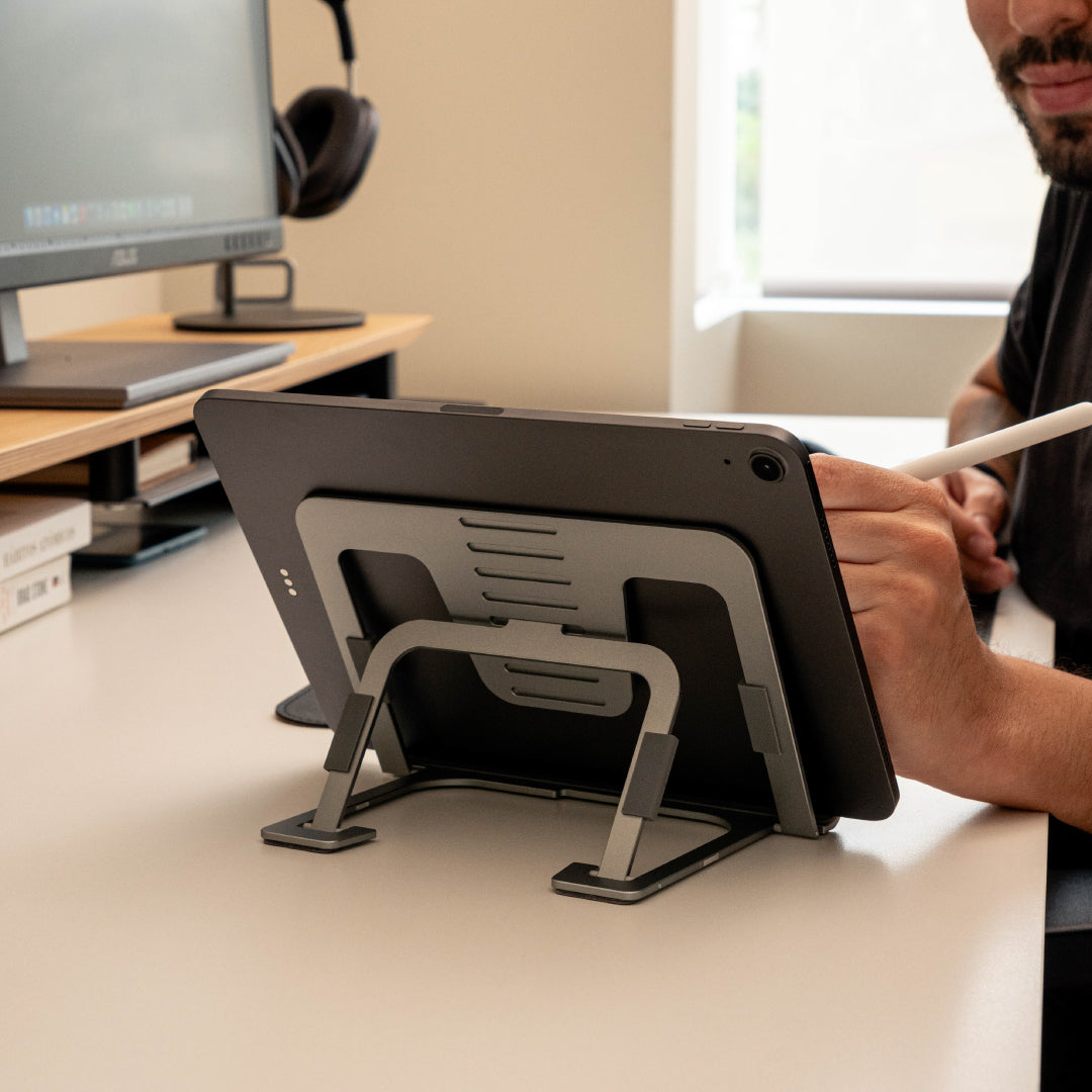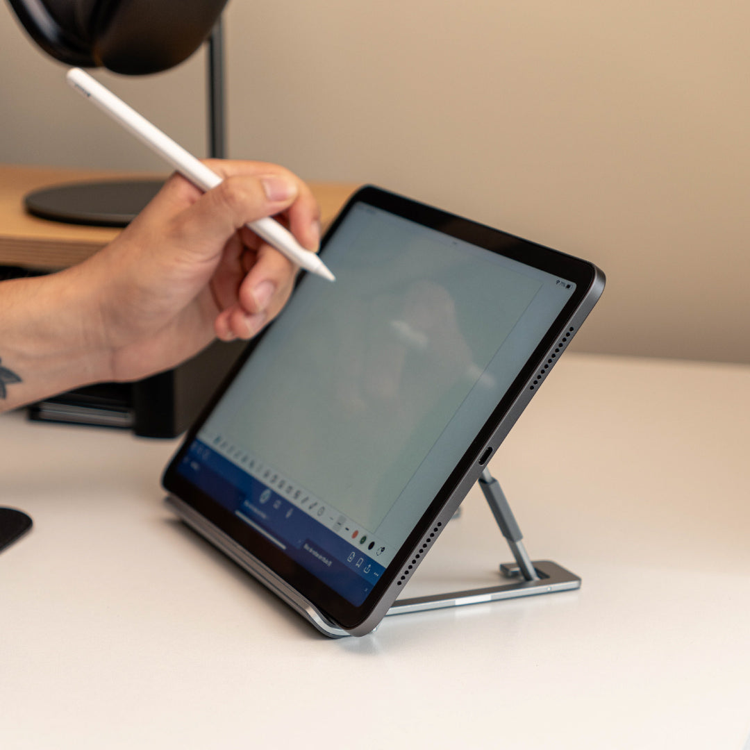 Su estructura en aluminio de alta calidad con base antideslizante garantiza firmeza incluso al escribir o dibujar con herramientas como el Apple Pencil. Además, su diseño plegable y ligero lo convierte en el compañero ideal para tu oficina, estudio o viajes.