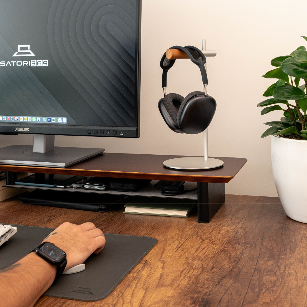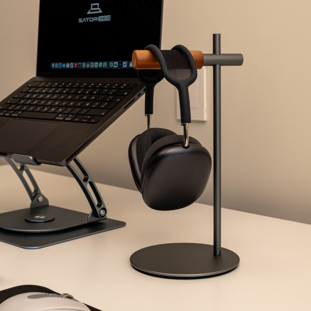 El Soporte de Audífonos Slim Minimalista de Satori369 es más que un organizador: es un detalle de diseño para quienes buscan un escritorio moderno, ordenado y con estilo. Su estructura combina la resistencia del aluminio anodizado con la calidez natural de la madera, creando una pieza sofisticada que complementa setups minimalistas, profesionales o de gaming.
